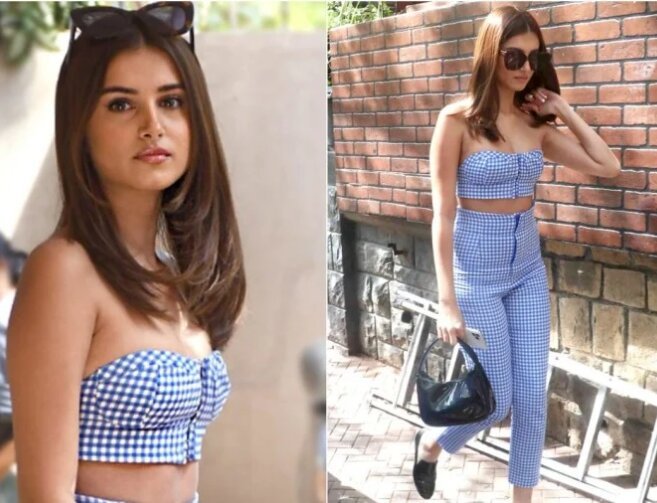 Girls will surely like Tara’s style of carrying tube tops in a stylish way. her dress in a checkered tube top and high vest pants for a lunch date looks amazing. Which is completed with open straight hair and glossy lipstick.