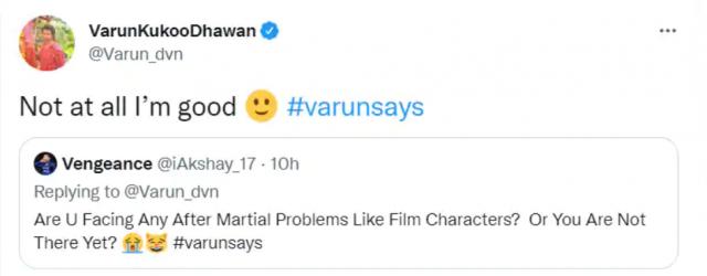 He was asked on the internet by a user if, like his character Kukoo in JugJugg Jeeyo, he was having marital problems. For the uninitiated, Kukoo and Naina resolve to stay quiet about their separation until Ginni, Kukoo’s younger sister, gets hitched. Thus, a follower tweeted to Varun, “Are U Facing Any After Martial Problems Like Film Characters? Or You Are Not There Yet? #varunsays.” Varun Dhawan responded to him saying, “Not at all I’m good #varunsays.”