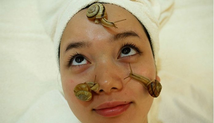 # There is a new beauty treatment at Clinical-Salon in Tokyo. Clinical-Salon began the unique facial which offers a five-minute session with the snails crawling on the face. Snails crawl on the face of a woman during the demonstration. It is said that the snail slime is believed to make one’s skin supple as well as remove dry and scaly patches.