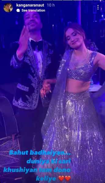 Amid this actress, Kangana Ranaut also took to her Instagram stories to share a few pictures of the couple and wrote “Make love not war … ❤️ Aaj mere yaar ki shaadi hai.“ while in other she wrote “Most gorgeous couple,”. In the picture, we can also see the queen actress all dressed in purple lehenga with a matching dupatta. She teamed up her look with Kamar-Patta, a stone-studded necklace, and of course a mang tikka.