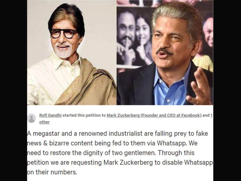 ‘A megastar and famous industrialist are falling prey to fake news and weird content through WhatsApp. The dignity of both these dignitaries has to be maintained. Through this petition we appeal to Mark Zuckerberg to disable WhatsApp on their numbers. ‘