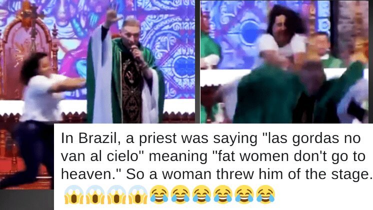 A lady was tuning in from the crowd yet lost it when the famous priest Marcelo Rossi said ‘husky ladies don’t go to paradise’ in the church. She pushed him off the stage and now the video is going viral.